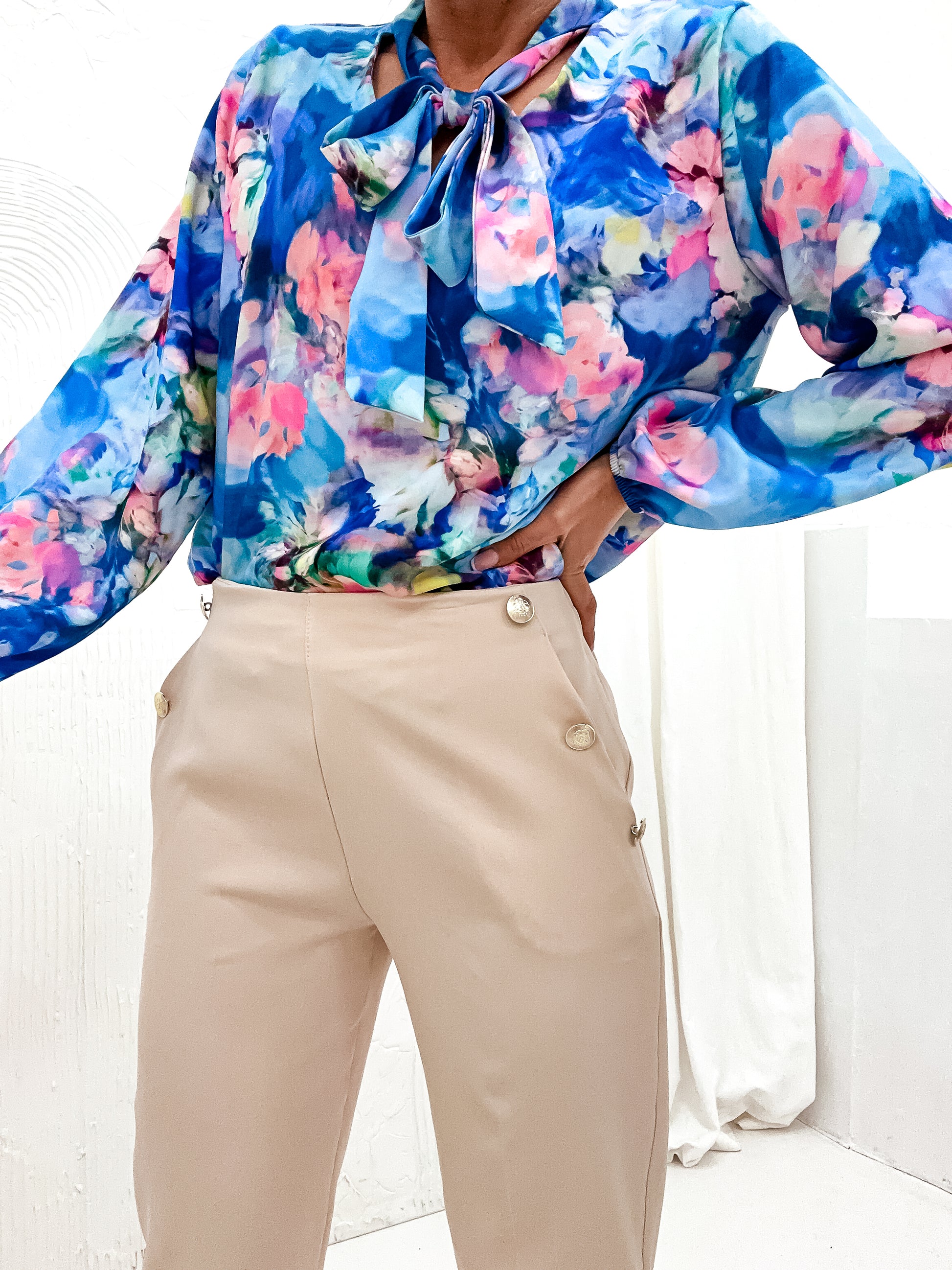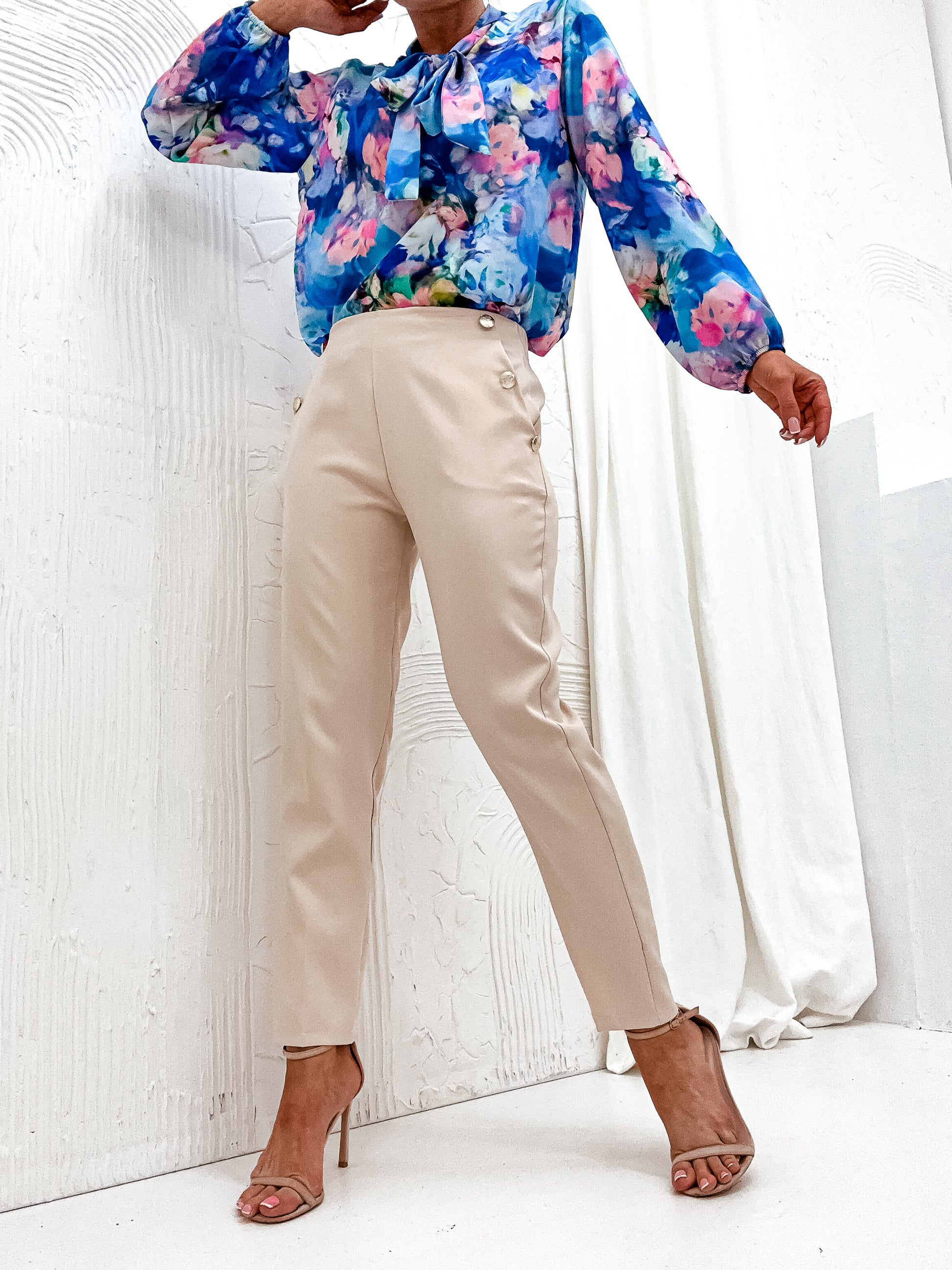 Klasiskās bēšas krāsas bikses, ar zelta krāsas pogām.